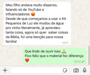 Quantas vezes seu filho pediu para você contar histórias da Bíblia esta semana? Nenhuma vez, né? Você está presa(o) em um ciclo frustrante onde sabe que precisa ensinar valores cristãos ao seu filho, e segue sem criar momentos memoráveis de conexão espiritual com seu filho. Eu acredito que você não quer mais isso pra sua família. O problema não está em você ou no seu filho – está na falta de material adequado que uma diversão e aprendizado cristão. E o kit Pequenos com Jesus vai te ajudar a criar momentos de conexão espiritual em família!